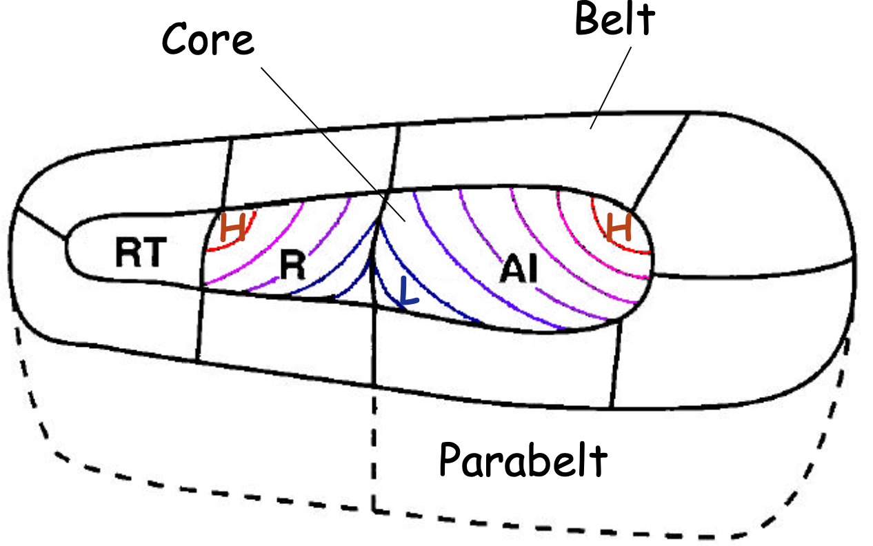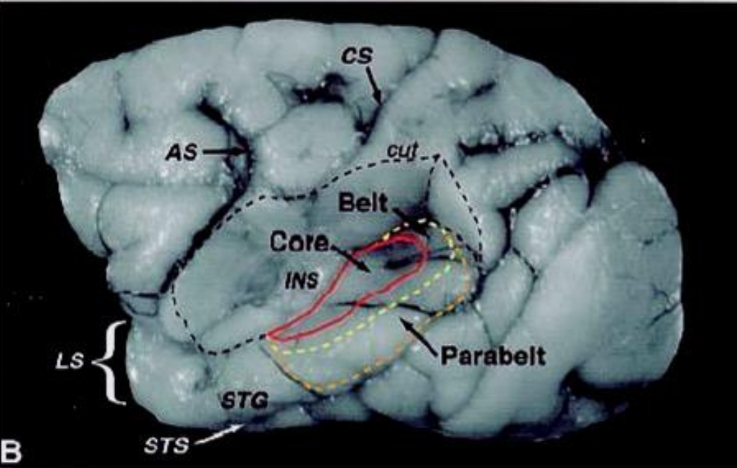- has a core, then a belt and then parabelt fields (which have several subfields) (Rolls et al. (2023) - Cerebral Cortex)