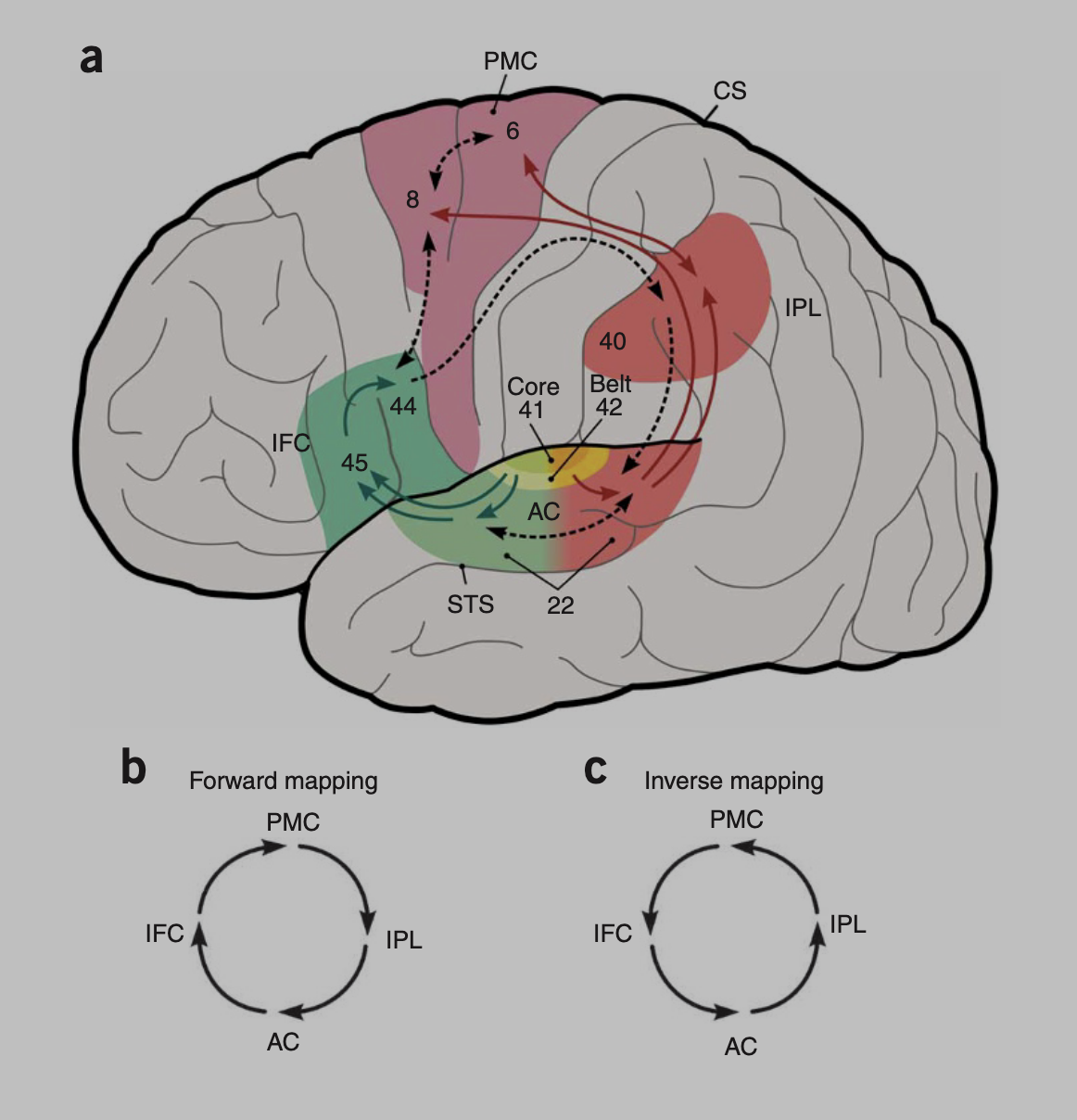 The IPL could provide an ideal interface, where feed-forward signals from motor preparatory networks in the inferior frontal cortex and premotor cortex (PMC) can be matched with feedback signals from sensory areas (Rauschecker & Scott (2009) - Nature Neuroscience)