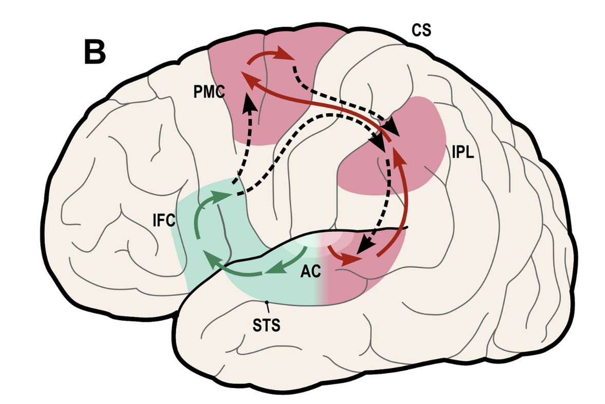 We propose that speech perception tasks rely to a greater extent on dorsal stream circuitry, whereas speech recognition tasks rely more on ventral stream circuitry (with shared neural tissue in the left STG), thus explaining the observed double dissociations (Hickok & Poeppel 2007 - Nature)
